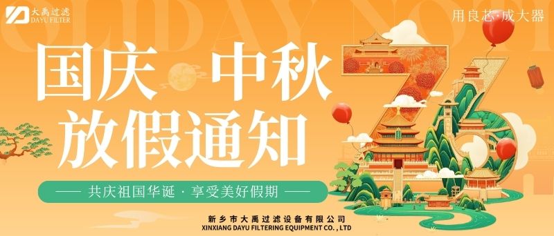 尊敬的客戶及合作伙伴:秋風送爽,丹桂飄香。值此國慶與中秋雙節(jié)來臨之際,謹向您及家人致以zui誠摯的節(jié)日祝福!根據(jù)國家法定節(jié)假日安排,結(jié)合公司實際情況,現(xiàn)將2025年國慶+中秋雙節(jié)放假安排及相關(guān)事項通知如下:一、放假時間2025年10月1日(星期三)至10月6日(星期一),共計6天。10月7日(星期二)起正常上班。9月28日(周日)、10月12日(周日)補班。二、業(yè)務(wù)服務(wù)說明放假期間,公司線上咨詢通道保持暢通。銷售人員將不定期查看并回復(fù)您的咨詢,但受假期影響,可能存在回復(fù)延遲的情況,敬請諒解。如遇緊急事項,您可撥打以下熱線:王經(jīng)理13613905650;李經(jīng)理13839073363,我們將竭誠為您服務(wù)。三、生產(chǎn)安排提醒因車間節(jié)前生產(chǎn)訂單已排滿,為確保假期前后生產(chǎn)質(zhì)量與效率,放假期間(10月1日至10月6日)將暫停安排新生產(chǎn)訂單生產(chǎn)。節(jié)前已下單的訂單將按原計劃正常推進,放假期間新接訂單將統(tǒng)一順延至10月7日復(fù)工后,按序安排生產(chǎn)。由此帶來的不便,我們深表歉意,感謝您的理解與支持。四、溫馨提示假期出行請注意安全,做好個人防護。公司官網(wǎng)及社交媒體平臺將持續(xù)更新節(jié)日動態(tài)及服務(wù)資訊,歡迎隨時關(guān)注。佳節(jié)共團圓,服務(wù)不間斷。值此雙節(jié)同慶的美好時刻,衷心感謝您長期以來對我司的信任與支持!我們期待在節(jié)后以更飽滿的熱情、更優(yōu).質(zhì)的服務(wù)與您攜手同行,共啟新程!此致敬禮!新鄉(xiāng)市大禹過濾設(shè)備有限公司2025年9月28日